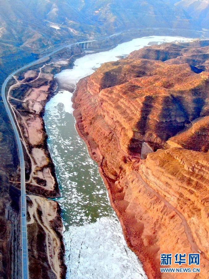 壶口瀑布至龙门水文站之间的黄河(12月26日摄,无人机照片)。新华社记者 刘诗平 摄