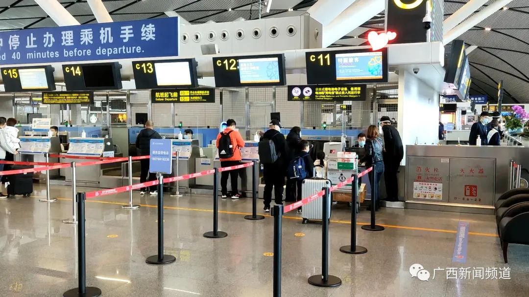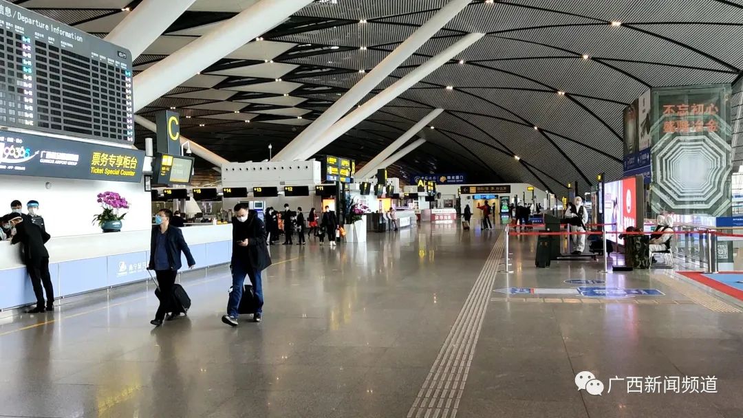 南宁吴圩国际机场 工作人员介绍到,预计今年客流量将达到25000人次,与去年春运首日相比人数减少一半左右。 南宁吴圩国际机场设置了健康码自助通道,可以有效疏散旅客,减少接触。
