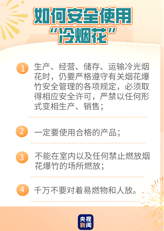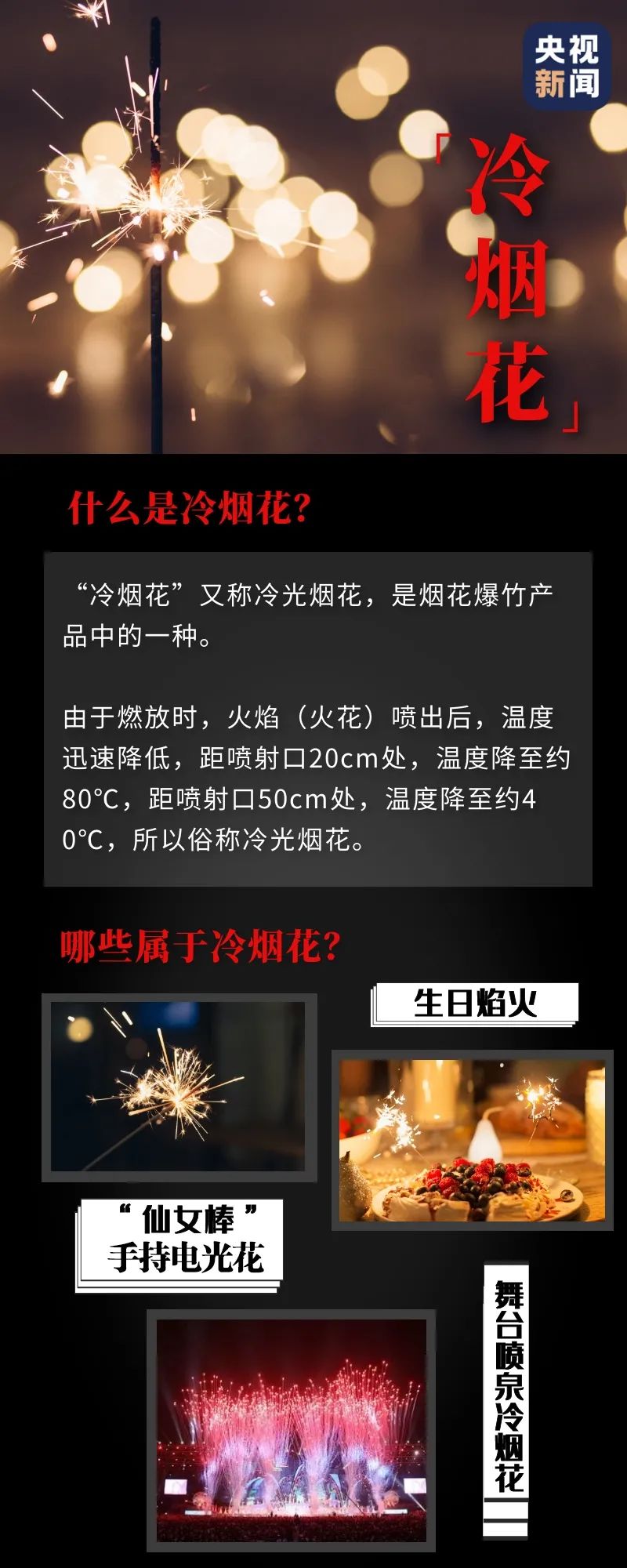 冷光烟花不“冷”,存火灾隐患 国务院安委办、应急管理部表示冷光烟花虽然火焰温度较低、烟雾较少 但喷射口温度仍高达700-800℃ 可灼伤人体、引燃物品 作为烟花爆竹 其易燃易爆危险品的基本属性并未改变