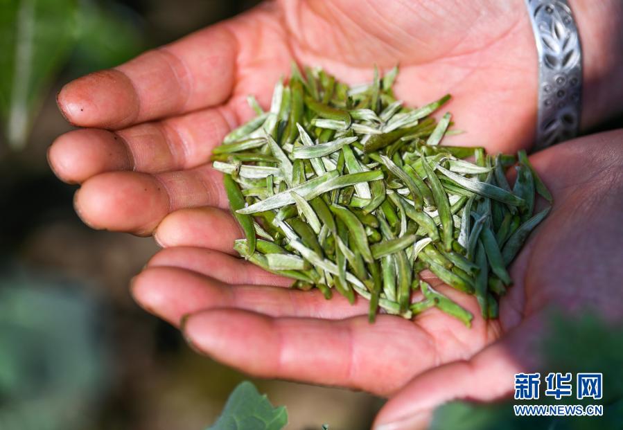 2月17日,贵州省独山县影山镇翁奇村的村民在展示新采摘的春茶。 雨水节气来临之际,贵州省黔南布依族苗族自治州独山县的村民抢抓农时进行松土追肥、修剪枝条、采摘早春茶等工作,田间地头一派繁忙景象。 新华社记者 杨文斌 摄
