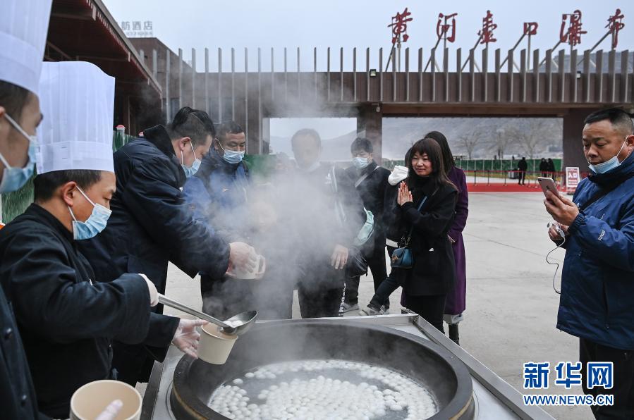 2月24日,陕西壶口瀑布景区工作人员(前左)为游客送上免费的汤圆。 从2月24日起,陕西壶口瀑布景区恢复对外开放。随着气温回升,黄河上游冰雪消融,水量增大,壶口瀑布的主瀑布恢复了往日奔腾咆哮的气势,黄河之水奔腾而下,形成壮观瀑布群。 临近元宵佳节,为丰富游客的旅游体验,陕西壶口瀑布景区还准备了猜灯谜、品汤圆、游美景、全时段精彩演出等活动,为远道而来的游客送上节日温暖。 新华社记者 陶明 摄