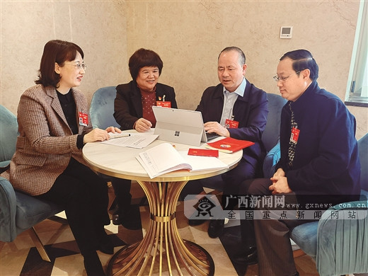 3月3日,住桂全国政协委员在驻地互相交流心得,完善提案。黄晓娟/摄