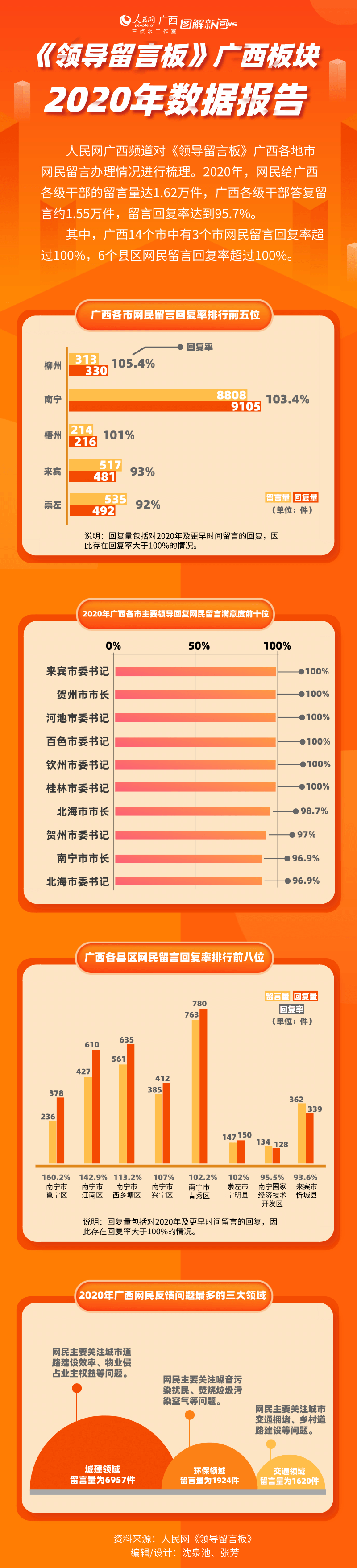 “熙龙湾临近红绿灯出口位置经常停有小车,因为停车挡住视线,行人出入有交通安全隐患。”2020年11月,来宾市忻城县网友在《领导留言板》向县委书记反映情况后,不到一个月,忻城县住房和城乡建设局就完成了现场核实和整改工作。 “领导及时听到群众呼声,相关部门处理也迅速有力,感谢!”忻城县高效率解决问题得到了网民点赞。 在《领导留言板》广西版块留言的网民中,既有在家种田的普通农民,也有异地读书的莘莘学子,有举家进城的务工人员,也有关心地方发展的退休干部。留言内容涉及就业难、看病难、出行难等民生问题,以及退休政策、城建规划、脱贫攻坚等方面的意见建议,涵盖国计民生方方面面。 通过分析留言,可以看到2020年广西网民反馈问题最多的三大领域是城建、环保与交通问题。城建领域留言量为6957件,网民主要关注城市道路建设效率、物业侵占业主权益;环保领域留言量为1924件,网民主要关注噪音污染扰民、焚烧垃圾污染空气等话题;交通领域留言量为1620件,网民主要关注城市交通拥堵、乡村道路建设等。 针对网友反映的问题和提出的建议,广西各地也探索出了不少留言办理工作经验。2020年8月,人民网与南宁市良庆区挂牌广西首个“互联网时代群众工作机制创新基地”,将《领导留言板》与良庆区移动官方平台连接,并开通“政点评”,改变过去“1家办理单位担当全部留言”的模式,重点发力“点评”功能,全链条打通“我要看”“我要说”“我要办”“我要评”。通过提升留言办理工作质效,进一步推动良庆区走好新时代网上群众路线。 针对《领导留言板》留言办理工作,忻城县委网信办安排专人负责,做到当日留言、当日认领,同时做好收集、处理和回复留言工作。对于群众的合理诉求,按照“属地”和“主管”相结合的原则,精准交办相关部门,并督促相关部门做好留言答复工作,及时将问题解决到位。 在自治区一级,为做好网友的留言办理工作,广西各相关部门明确责任、积极联动,形成了“两厅指导,一办协调,多方承办”的留言办理工作机制:即自治区党委办公厅、政府办公厅指导督促;自治区党委网信办统筹协调,收集、转办留言,并组织各市、各相关部门开展留言办理工作;各市党委、政府和区直相关部门负责具体承办。 工作机制不断创新,让广西网上群众路线走得更好更实。去年11月,2020网上群众工作峰会在四川省遂宁市成功举行。本次峰会公布的“2020年度人民网网民留言办理工作民心汇聚单位、机制创新单位、活力奋进单位、实干担当单位”,广西有12家留言办理单位获奖,位居全国前列。 |