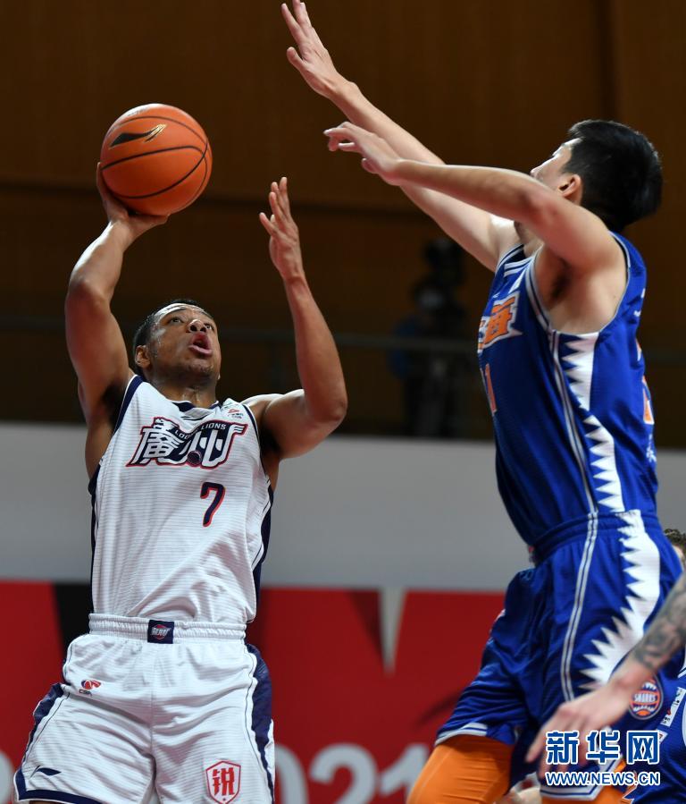 3月8日,时代中国广州队球员祝铭震(左)在比赛中投篮。 当日,在浙江诸暨举行的2020-2021赛季中国男子篮球职业联赛(CBA)第三阶段第43轮比赛中,时代中国广州队以96比95战胜上海久事队。 新华社记者 胡虎虎 摄