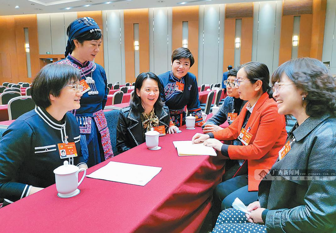 3月8日是“三八”国际劳动妇女节,住桂全国政协委员中的部分女性 委员在会议间隙仍继续讨论政府工作报告,积极履职尽责。李芳林 摄