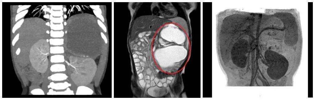 什么是畸胎瘤 畸胎瘤是人体幼稚生殖细胞发生变异而形成的肿瘤,常发生在卵巢,其次是在睾丸,此外还可以发生在纵隔、骶尾部、腹膜后等部位。 畸胎瘤的瘤体内可见皮脂、毛发、骨头、软骨甚至牙齿、眼珠,肌肉、脑等组织。由于这些组织成分与人体正常组织成分十分相似,有点像发育畸形的“胎儿”,故此得名。 “年龄这么小,却在腹膜长了这么大一个畸胎瘤,这样的病例是非常罕见的。”柳州市妇幼保健院小儿外科副主任欧阳昱安慰慧慧妈妈,畸胎瘤良性率为90%,但在发现后应该尽快切除,否则随着年龄的增长,转为恶性的几率会逐渐提高。 “慧慧的肿瘤很大,已经占据了腹腔很多空间,如不及时处理,会压迫邻近脏器。如瘤体压近消化道会出现肠梗阻;推挤膈肌会出现呼吸困难;如与消化道相通时可出现瘘,瘤体还可发生感染引起感染症状。”欧阳昱副主任告诉慧慧妈妈。听了专家的中肯建议后,慧慧妈妈同意尽快给孩子做手术。 ▲ 肿瘤挤压腹腔脏器移位