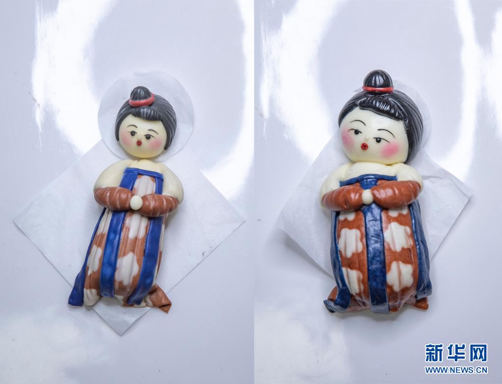 这是4月13日在重庆市渝北区欧阳勤芸工作室内拍摄的制作完成还未蒸制(左图)和蒸好后(右图)的唐俑造型馒头(拼版照片)。新华社记者 黄伟 摄