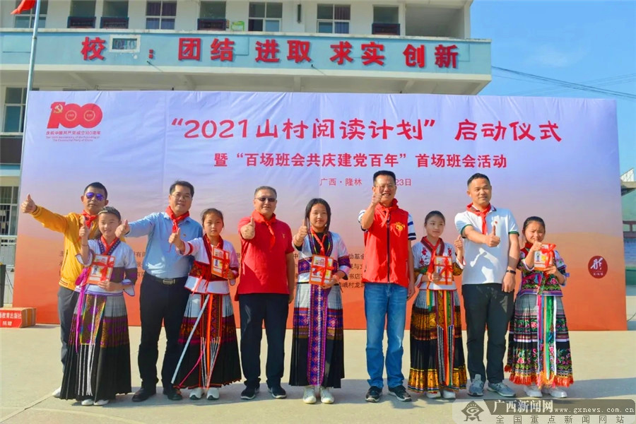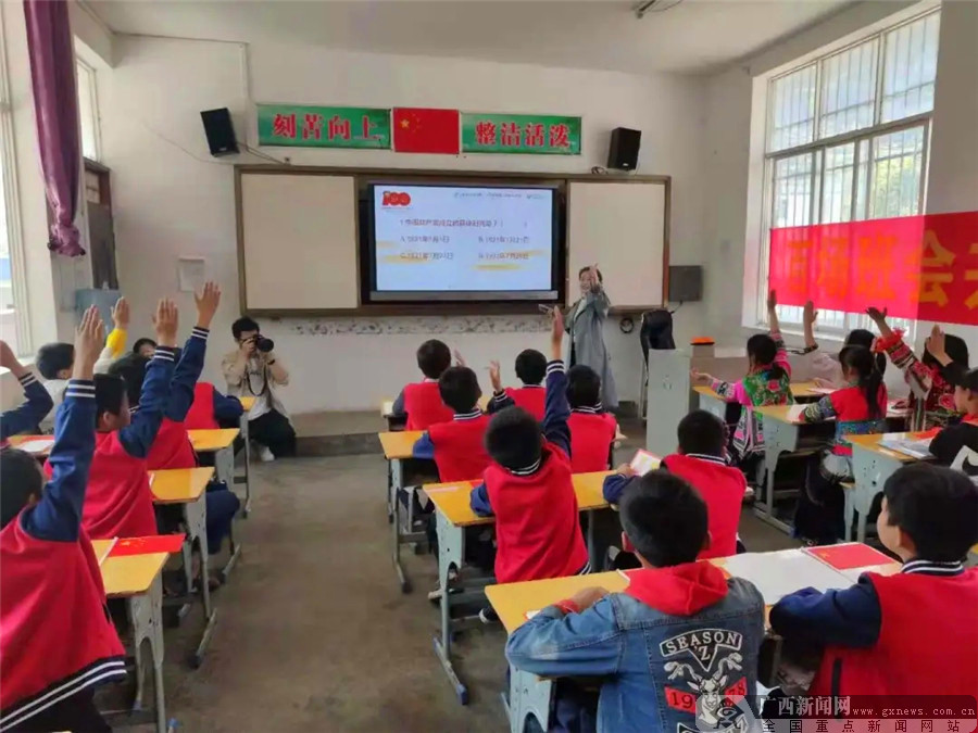 许琴与孩子们分享红军故事。 自治区党委宣传部一级调研员、隆林各族自治县德峨镇德峨村“第一书记”胡朝晖对活动主办单位人员表示了热烈欢迎与衷心感谢,并叮嘱参与活动的孩子们养成阅读的好习惯,从中吸取能量,长大之后为家乡建设和振兴贡献力量。 2021年是中国共产党百年华诞,今年的“山村阅读计划”围绕这一主题,策划“百场班会共庆建党百年”及“童心向党‘六一’大联动”两大活动。“百场班会共庆建党百年”计划组织区内100个班级的小学生,开展“共庆建党百年”主题班会;“童心向党‘六一’大联动”则邀请广西名师录制《童心向党“六一”公开课》,“六一”儿童节前在山区学校播放,将优质主题教育资源作为儿童节礼物送到山区。 启动仪式后,“百场班会共庆建党百年”活动首场班会在龙洞小学五(1)班精彩上演,同学们以唱红歌、分享红色故事、开展知识问答等形式,共同学习党史,共庆建党百年。