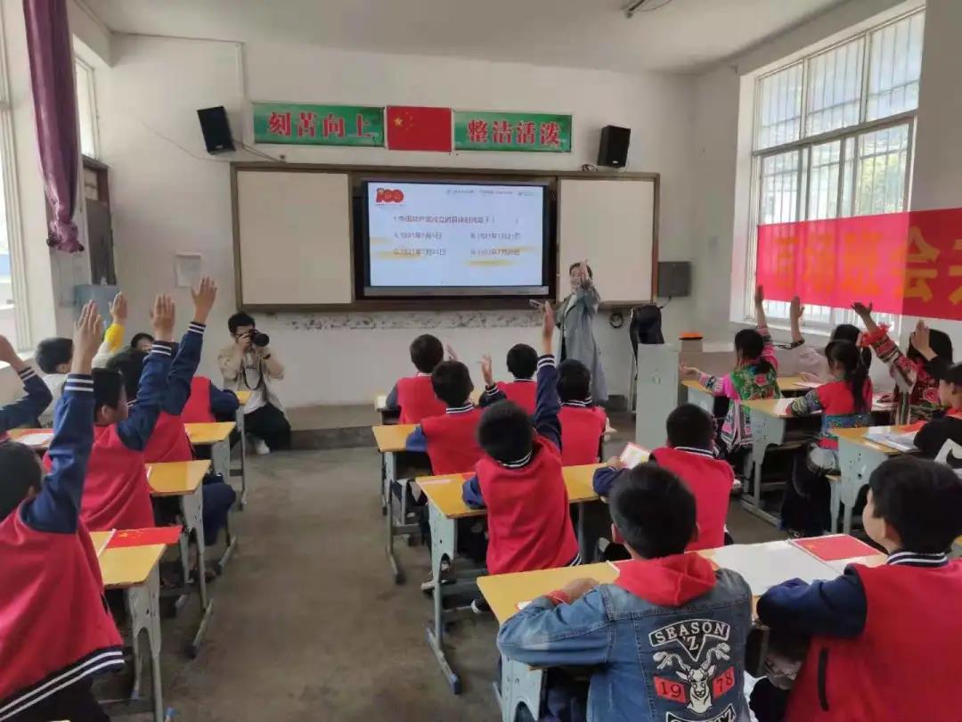 班会现场。 启动仪式后,“百场班会共庆建党百年”活动首场班会在龙洞小学五(1)班精彩上演,同学们以唱红色歌曲、分享红色故事、开展知识问答等形式,共同学习党史,共庆建党百年。