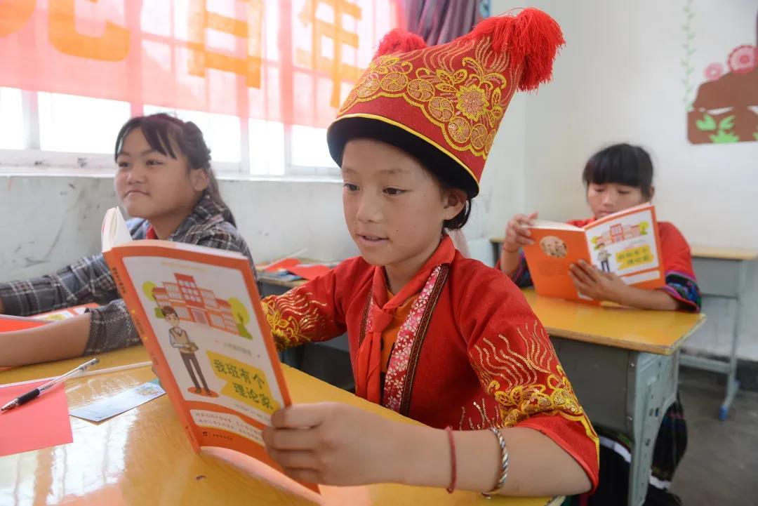 赠书仪式。 广西壮族自治区党委宣传部一级调研员、隆林各族自治县德峨镇德峨村第一书记胡朝晖对活动主办单位人员表示了热烈欢迎与衷心感谢。胡朝晖书记叮嘱参与活动的小学生:“我坚信阅读能够传递知识、传递信念、传递力量,希望小朋友们都能养成阅读的好习惯,从中汲取智慧和能量,长大之后为家乡建设和振兴贡献力量。” 2021年是中国共产党建党一百周年,“山村阅读计划”围绕这一主题,策划“百场班会共庆建党百年”及“童心向党‘六一’大联动”两大活动。“百场班会共庆建党百年”计划组织区内100个班级的小学生,开展“共庆建党百年”主题班会;“童心向党‘六一’大联动”则邀请广西名师录制《童心向党“六一”公开课》,“六一”儿童节前在山村学校播放,将优质主题教育资源作为儿童节礼物送到山村。“目前区内已有103个班级报名参与活动,并获得了平安产险广西分公司捐赠的《我班有个理论家》图书,捐赠图书价值超10万元。广西教育出版社也精心挑选了一批优质图书进行捐赠。”广西教育出版社副社长、副总编辑陆思成介绍说。