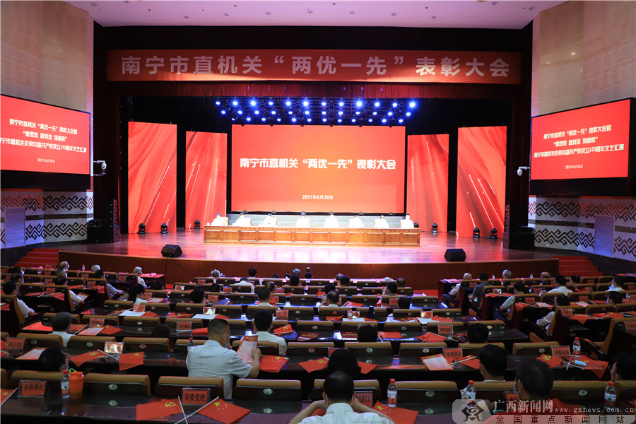 图为南宁市直机关“两优一先”表彰大会现场。广西新闻网记者 唐雨薇 摄 南宁市委市直机关工委举行“两优一先”表彰大会 暨庆祝中国共产党成立100周年文艺汇演 广西新闻网南宁6月29日讯(记者 唐雨薇 通讯员 翟晓娟)6月28日,南宁市直机关“两优一先”表彰大会暨“感党恩 跟党走 强首府”南宁市直机关庆祝中国共产党成立100周年文艺汇演在南宁人民会堂举行。 党的十九大以来,南宁市直各机关党组织坚持以习近平新时代中国特色社会主义思想为指导,认真贯彻落实习近平总书记在中央和国家机关党的建设工作会议上的重要讲话精神,以政治建设为统领,增强“四个意识”、坚定“四个自信”、做到“两个维护”,扎实开展“让党中央放心、让人民群众满意的模范机关”创建工作,全面推进党支部标准化规范化建设,充分发挥基层党组织战斗堡垒作用和党员先锋模范作用,为全面落实强首府战略,加快打造引领全区高质量发展的核心增长做出了积极贡献。 当天的表彰会表彰了82名“优秀共产党员”,71名“优秀党务工作者”,59个“先进基层党组织”。授予8个“模范机关示范单位”称号;向11名机关退休党员颁发“光荣在党50年”纪念章。会议号召南宁市直机关各党组织要以受表彰对象为榜样,更加紧密地团结在以习近平同志为核心的党中央周围,高举中国特色社会主义伟大旗帜,不忘初心、牢记使命,学习先进、争当先进,持续开展模范机关创建工作,充分发挥党组织的战斗堡垒和党员的先锋模范作用,为全面落实强首府战略,推动南宁高质量发展作出新的更大贡献。