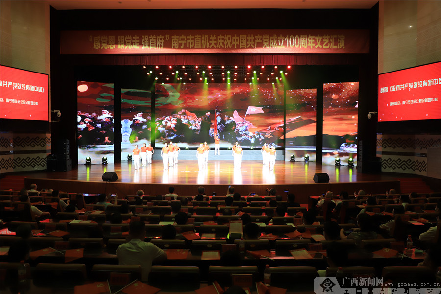 图为“感党恩 跟党走 强首府”南宁市直机关庆祝中国共产党成立100周年文艺汇演现场。广西新闻网记者 唐雨薇 摄 在随后举行的“感党恩 跟党走 强首府”南宁市直机关庆祝中国共产党成立100周年文艺汇演活动中,来自南宁市直机关12个单位的270多名干部职工,通过歌曲联唱、情景剧、配乐诗朗诵、舞蹈、大合唱等方式,颂扬中国共产党百年光辉历程,讴歌改革开放特别是党的十八大以来中国特色社会主义事业取得的辉煌成就,展示市直机关党组织和广大党员永远跟党走,奋进新时代的昂扬斗志。 |