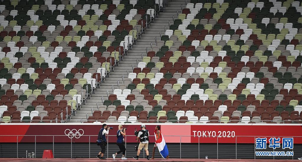 8月2日,荷兰选手哈桑(右一)在东京奥运会田径项目女子5000米决赛后,从空旷看台前跑过,庆祝胜利。新华社记者 杜宇 摄