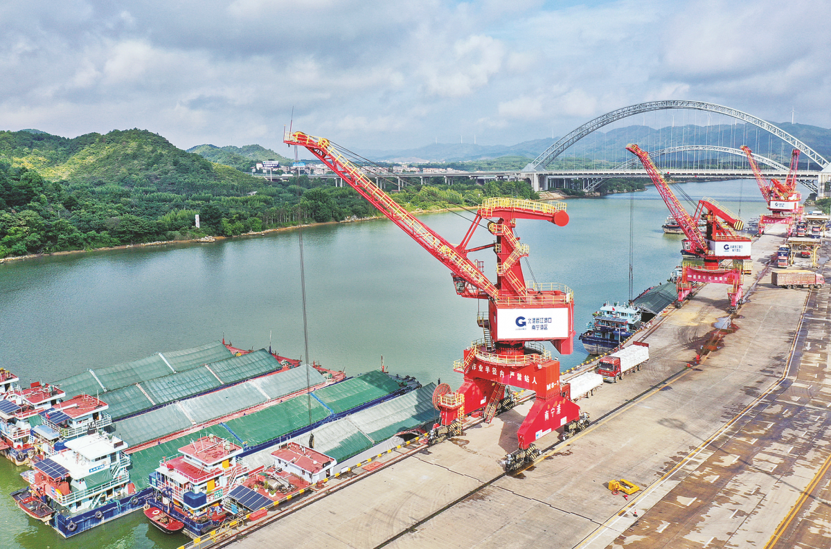 南宁港六景作业区正在有序装卸货物。(黄汝德 摄)