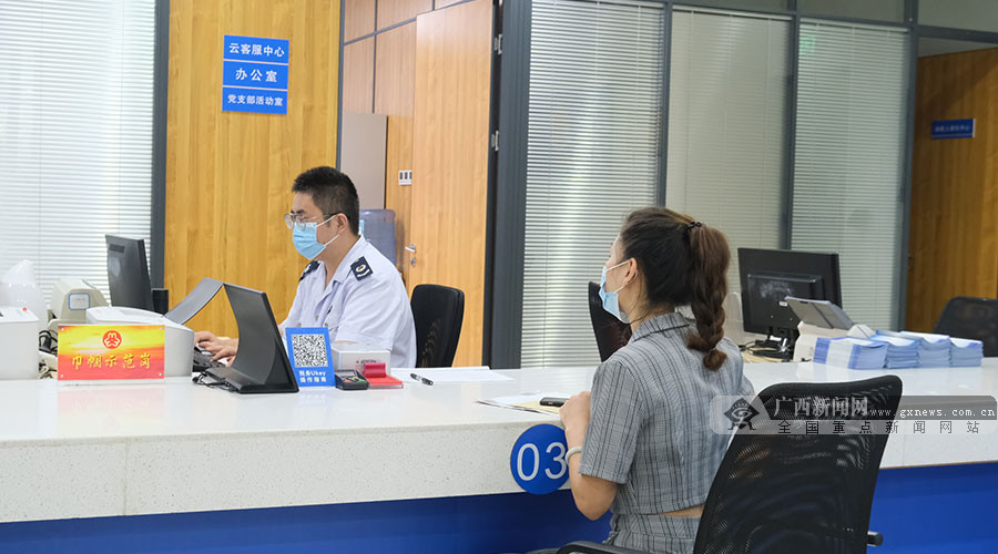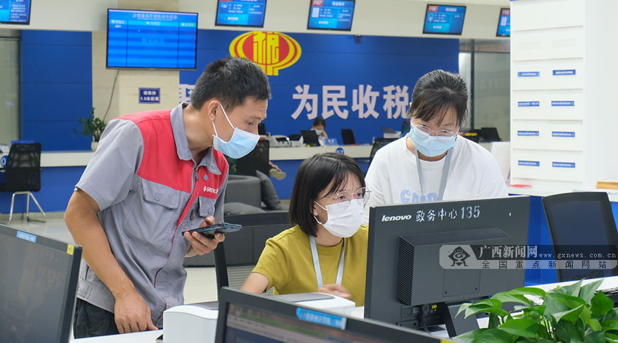 工作人员为杨容娇办理企业报税业务。广西新闻网记者 陶洁 摄 广西青山建设工程有限公司下属凭祥2号搅拌站副站长杨容娇前来办理企业报税业务,经工作人员审核办理,十余分钟便完成了所有手续。“对于企业来说,这为我们节省了很多精力,不需要多次来回跑,这是极大的便利。”杨容娇说道。