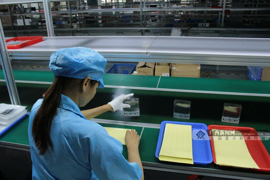 在三诺跨境电子产业示范园包装流水线,工人们在进行包装工作。广西新闻网记者 陶洁 摄