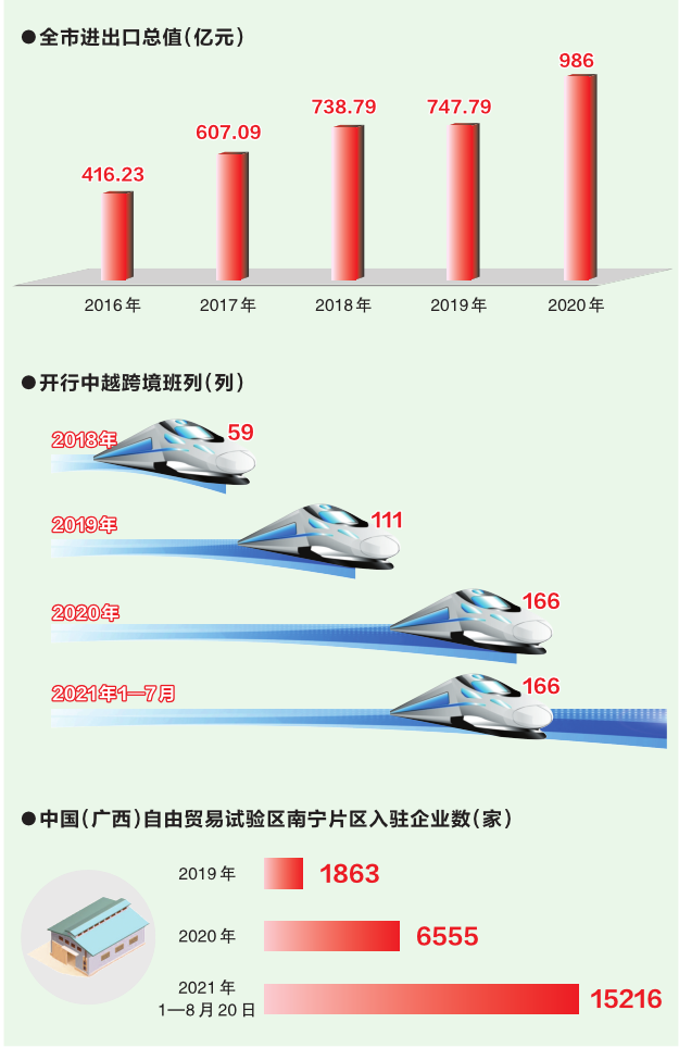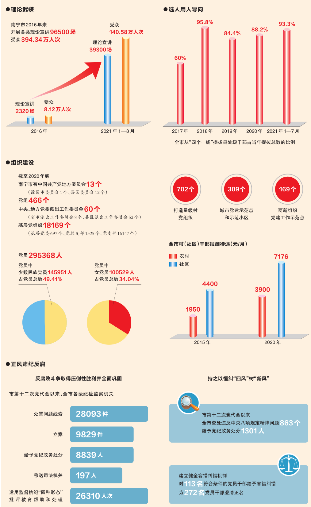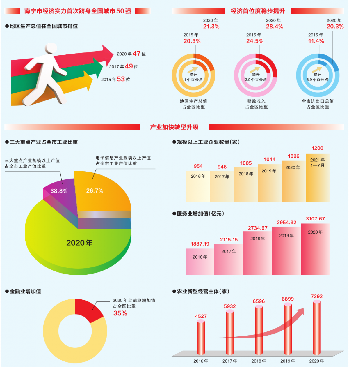 我市积极融入“一带一路”建设,借助建设中国(广西)自由贸易试验区、面向东盟的金融开放门户核心区等机遇,推动“南宁渠道”持续升级,助力经济社会高质量发展。图为繁荣兴旺的中国(广西)自由贸易试验区南宁片区。 记者黄维业摄 自市第十二次党代会以来的这五年,是南宁发展历史上具有里程碑意义的五年。面对错综复杂的国际形势、艰巨繁重的国内改革发展稳定任务,特别是突如其来的新冠肺炎疫情,市委坚定不移贯彻落实习近平新时代中国特色社会主义思想,在党中央和自治区党委的坚强领导下,团结带领全市各族人民解放思想、改革创新、扩大开放、担当实干,打好打赢“三大攻坚战”,扎实推进“六大升级”工程,全面落实强首府战略,推动经济社会高质量发展,实现“十三五”规划胜利收官,与全国同步全面建成小康社会,“十四五”规划开局顺利,为开启社会主义现代化建设新征程奠定了坚实基础。 艰难方显勇毅,磨砺始得玉成。全市各族儿女团结一心,风雨同舟,同甘共苦,真抓实干,善作善成,取得了辉煌成果。在这砥砺奋进的五年中,我们尽锐出战精准发力,脱贫攻坚取得全面胜利;我们聚力产业加快转型,经济综合实力显著增强;我们深化改革强化创新,发展动力活力持续迸发;我们扩大开放厚植优势,“南宁渠道”作用更加凸显;我们突出治水建城为民,生态宜居品质巩固提升;我们以民为本发展惠民,民生保障水平大幅提高;我们坚持从严管党治党,党的建设得到全面加强。 经济综合实力显著增强