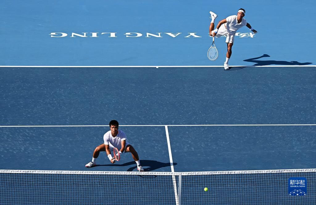 9月8日,河北队组合柏衍(右)/孙发京在比赛中。 当日,在陕西杨凌举行的第十四届全国运动会网球男子双打决赛中,天津队组合李喆/高鑫以2比1战胜河北队组合柏衍/孙发京,夺得冠军。 新华社记者 刘潇 摄