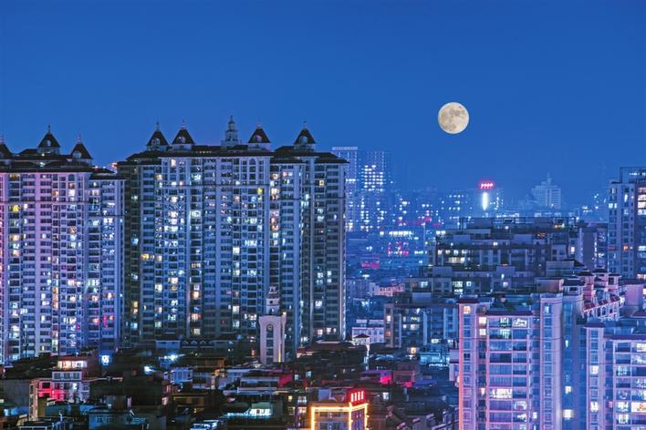 中秋之夜,雨过天晴,一轮圆月升挂在玉林城区上空。明净的月光下,万家灯火,市民欢乐团圆,共度美好时光。