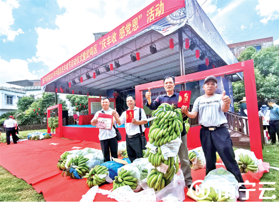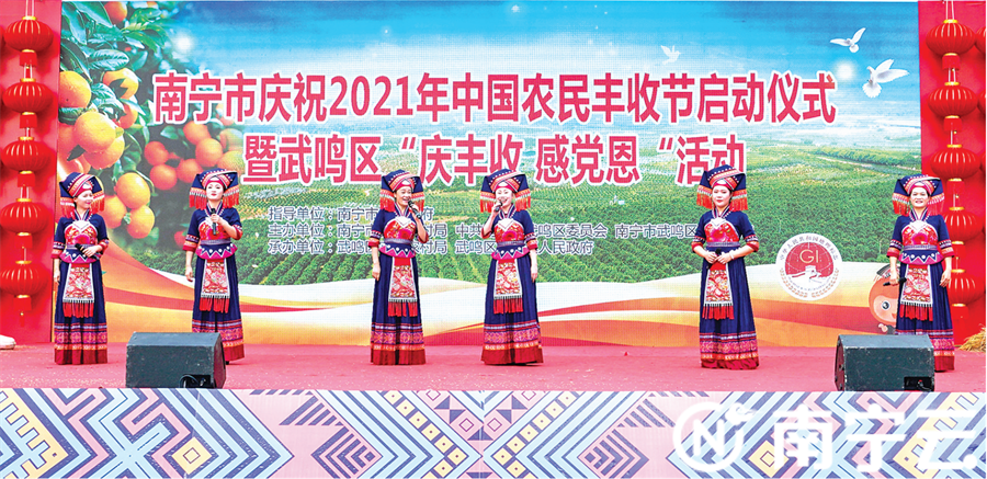 9月23日,南宁市庆祝2021年中国农民丰收节启动仪式暨武鸣区“庆丰收 感党恩”活动在武鸣区城厢镇大皇后村举行。图为文艺演出表演。 庆丰收感党恩 美丽乡村有“面子”更有“里子” 昨日,南宁市在武鸣区城厢镇大皇后村举行庆祝2021年中国农民丰收节启动仪式暨武鸣区“庆丰收 感党恩”活动。活动设特色农产品大赛、乡村振兴产品展销、文艺演出、美食展示、农民趣味运动、“庆丰收”农民活动、非遗展示等环节,展出火龙果、柚子、香蕉、黄皮果等各类农特产品及衍生加工产品,晒出了农民丰收的喜悦和对美好新生活的满足。启动仪式上,主办方还举行了沃柑地理标志证明商标使用授权仪式,为规范化管理水果分选企业颁奖,为武鸣区级优秀家庭农场授牌等。 近年来,南宁市以实施乡村振兴战略为总抓手,推动首府农业集聚化、品牌化、融合化发展,农业全产业链提升和三产融合发展成效突出,主要农产品连年丰收,粮食、蔬菜、水果、畜禽、水产品等多项农业产业在全国全区位居前列。2020年,全市粮食总产量209.28万吨,蔬菜产量657.02万吨,水果产量401.23万吨,家禽、肉牛、肉羊分别出栏1.82亿羽、14.65万头、16.98万头,禽蛋、牛奶产量分别达2.8万吨、1.46万吨,农民收入连年增长。以南宁火龙果、南宁香蕉、横州茉莉花、武鸣沃柑为代表的“邕系”农产品品牌知名度和影响力进一步扩大和提升,横州茉莉花、茉莉花茶综合品牌价值达202.97亿元,实现广西最具价值农业品牌四连冠。 南宁市还扎实推进农产品仓储保鲜冷链设施建设,投资6984万元,建设冷链设施43座,库容约7万立方米;构建农产品出村进城“最初一公里”体系,带动农业产业发展,促进产销对接,南宁现代特色农业不断做优做强,向标准化、规模化、集约化高质量发展快速迈进。在乡村建设方面,南宁市全面完成农村人居环境整治三年行动收官战,全市农村垃圾治理有效推进,农村卫生厕所普及率达96.5%,村镇污水设施加快建设,目前全市累计建成40个市级生态综合示范村。