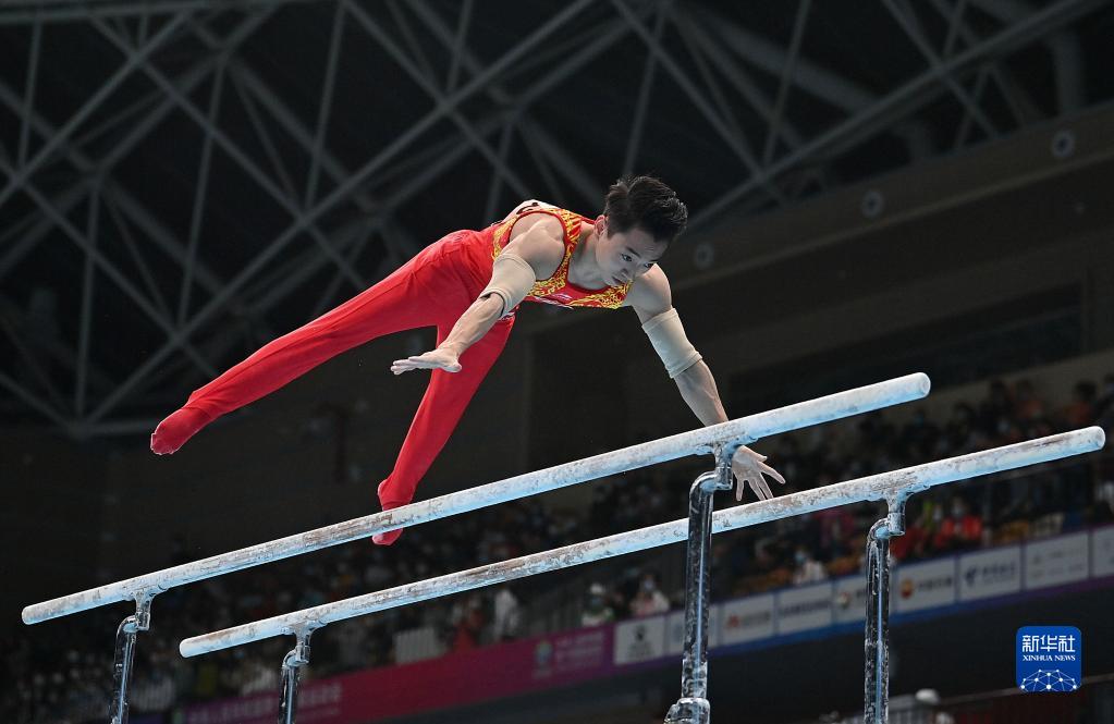 9月26日,四川队选手邹敬园在双杠比赛中。 当日,在西安举行的第十四届全运会体操项目男子双杠决赛中,四川队选手邹敬园以16.300分获得冠军,江苏队选手尤浩以15.620分获亚军,广东队选手杜奕锌以15.080分获季军。 新华社记者 孙非 摄
