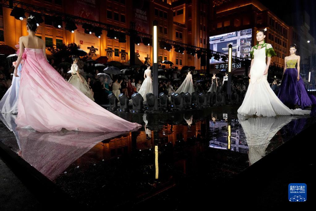 9月26日,模特在北京时装周闭幕大秀上展示劳伦斯·许设计的时装。 当日,2021北京时装周闭幕盛典在北京王府井步行街举行,设计师劳伦斯·许与保利·中国中丝集团联袂上演以“蝶”为主题的闭幕大秀。为期10天的2021北京时装周举办了线上线下近百场活动,近200个品牌、千余位设计师参与其中。 新华社记者 陈建力 摄