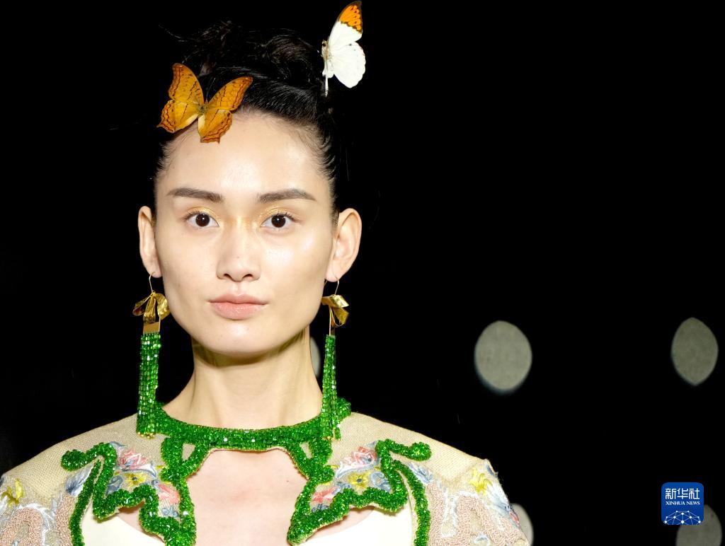 9月26日,模特在北京时装周闭幕大秀上展示劳伦斯·许设计的时装。 当日,2021北京时装周闭幕盛典在北京王府井步行街举行,设计师劳伦斯·许与保利·中国中丝集团联袂上演以“蝶”为主题的闭幕大秀。为期10天的2021北京时装周举办了线上线下近百场活动,近200个品牌、千余位设计师参与其中。 新华社记者 陈建力 摄