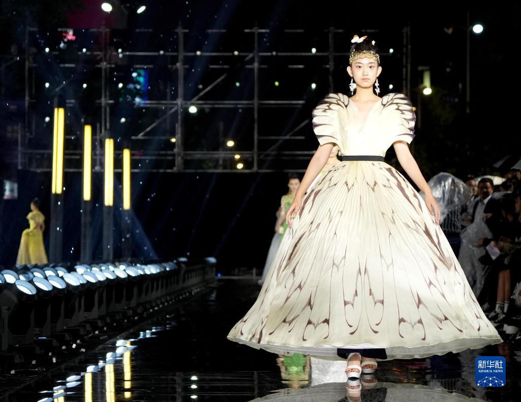 9月26日,模特在北京时装周闭幕大秀上展示劳伦斯·许设计的时装。 当日,2021北京时装周闭幕盛典在北京王府井步行街举行,设计师劳伦斯·许与保利·中国中丝集团联袂上演以“蝶”为主题的闭幕大秀。为期10天的2021北京时装周举办了线上线下近百场活动,近200个品牌、千余位设计师参与其中。 新华社记者 陈建力 摄