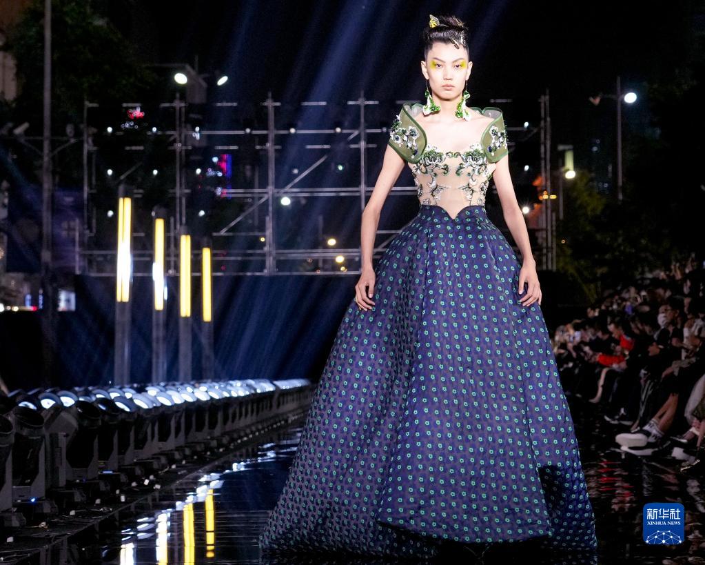 9月26日,模特在北京时装周闭幕大秀上展示劳伦斯·许设计的时装。 当日,2021北京时装周闭幕盛典在北京王府井步行街举行,设计师劳伦斯·许与保利·中国中丝集团联袂上演以“蝶”为主题的闭幕大秀。为期10天的2021北京时装周举办了线上线下近百场活动,近200个品牌、千余位设计师参与其中。 新华社记者 陈建力 摄