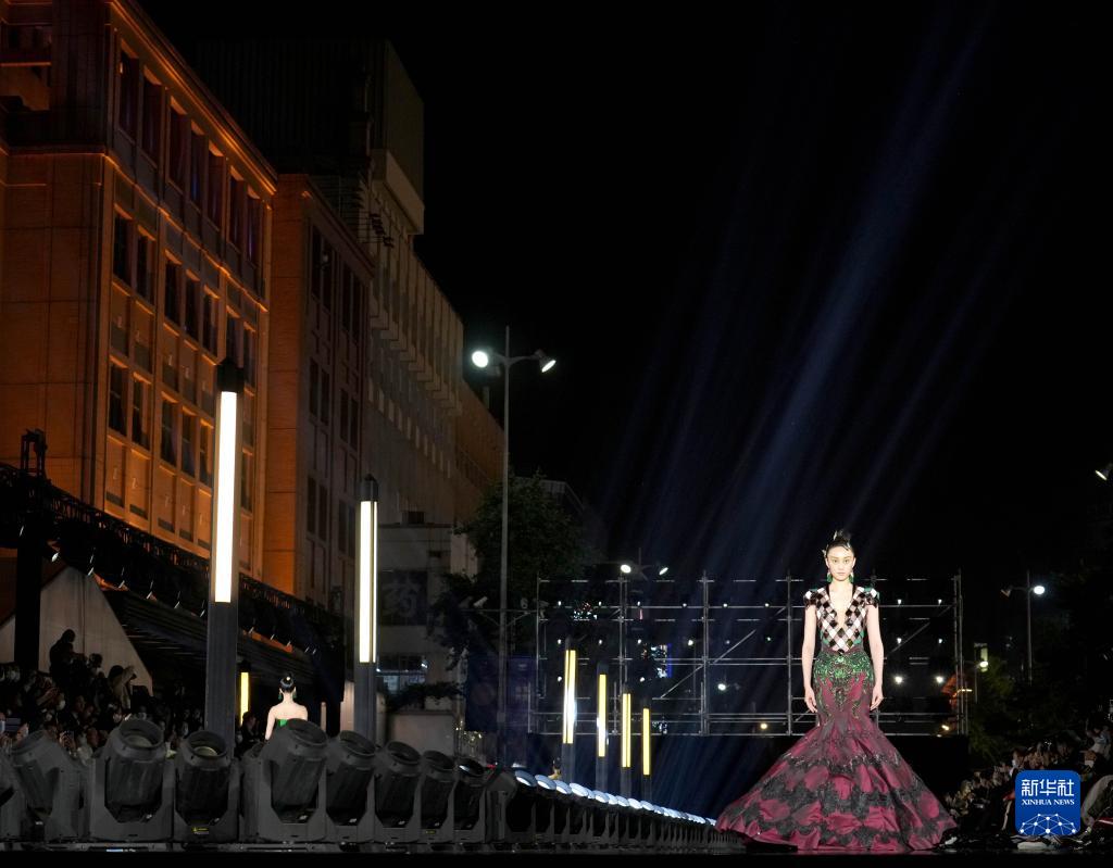 9月26日,模特在北京时装周闭幕大秀上展示劳伦斯·许设计的时装。 当日,2021北京时装周闭幕盛典在北京王府井步行街举行,设计师劳伦斯·许与保利·中国中丝集团联袂上演以“蝶”为主题的闭幕大秀。为期10天的2021北京时装周举办了线上线下近百场活动,近200个品牌、千余位设计师参与其中。 新华社记者 陈建力 摄