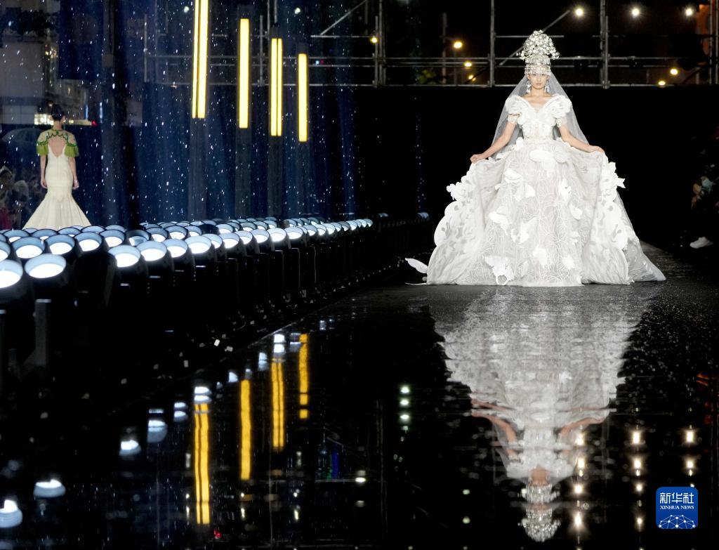 9月26日,模特在北京时装周闭幕大秀上展示劳伦斯·许设计的时装。 当日,2021北京时装周闭幕盛典在北京王府井步行街举行,设计师劳伦斯·许与保利·中国中丝集团联袂上演以“蝶”为主题的闭幕大秀。为期10天的2021北京时装周举办了线上线下近百场活动,近200个品牌、千余位设计师参与其中。 新华社记者 陈建力 摄