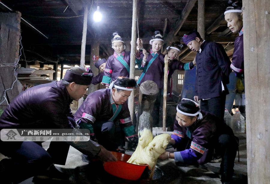 1月19日,在三江侗族自治县良口乡良帽村,村民们在用石碓舂糍粑。广西新闻网通讯员 龚普康 梁秀明供图