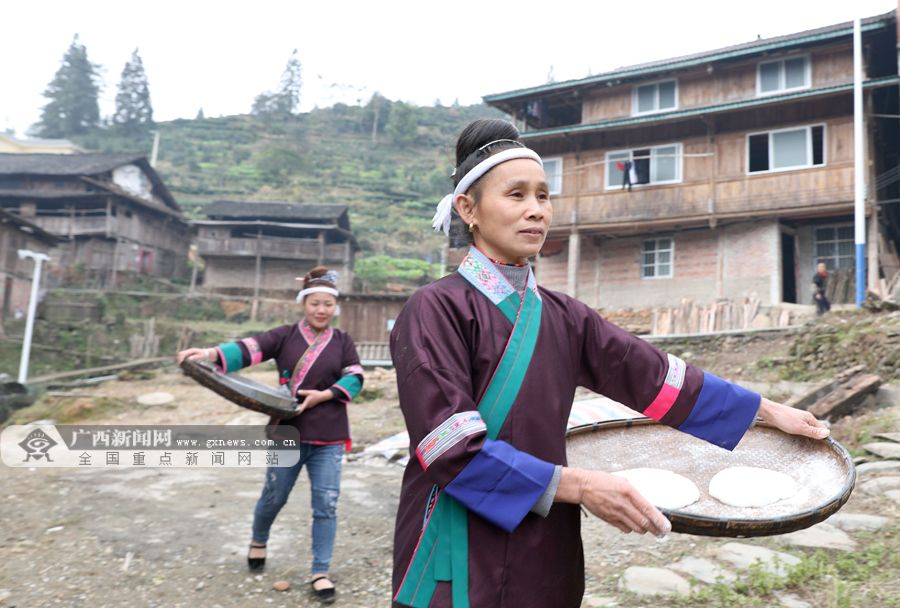 1月19日,在三江侗族自治县良口乡良帽村,两名妇女端着糯米粉回家。广西新闻网通讯员 龚普康 梁秀明供图