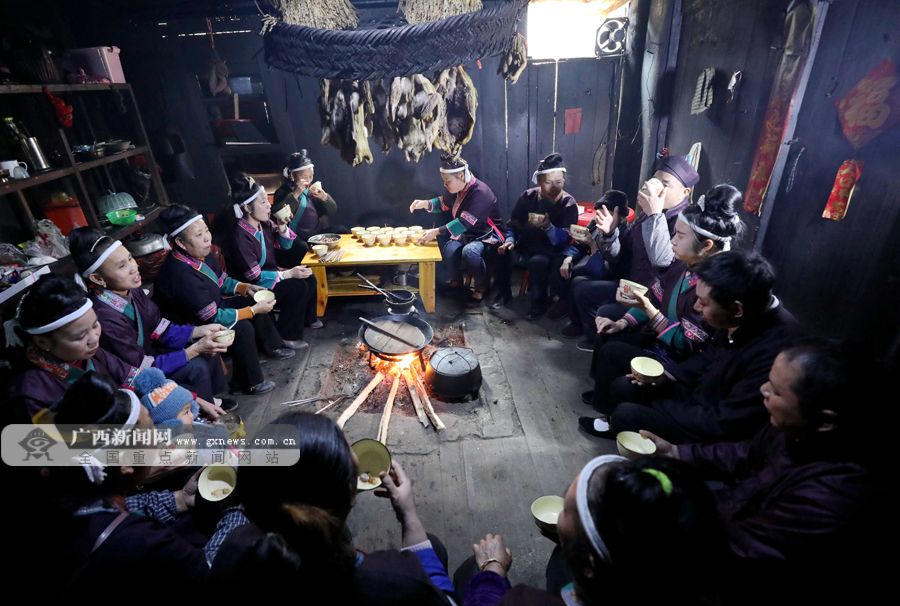 1月19日,在三江侗族自治县良口乡良帽村,村民们在围着火塘吃油茶。广西新闻网通讯员 龚普康 梁秀明供图