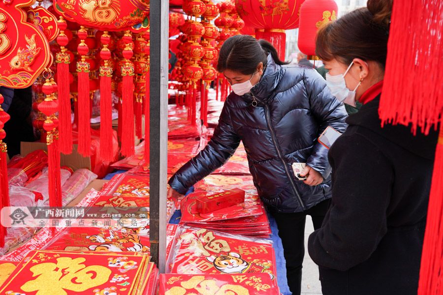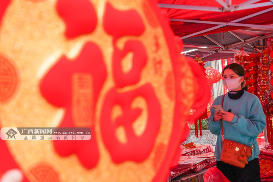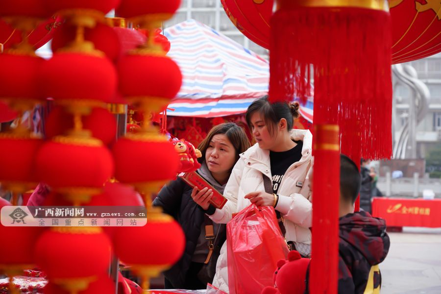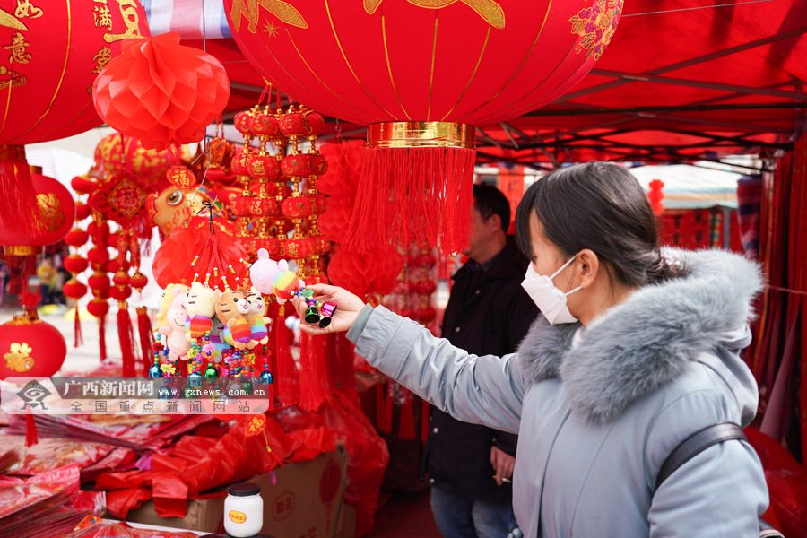 群众在年货市场选购新年饰品。广西新闻网通讯员 唐广东供图