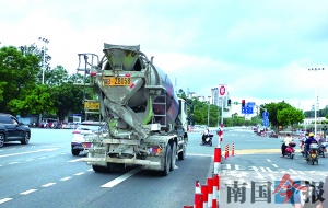 7月8日上午,记者在柳州市柳太路潭中西路口、柳太路和平路口、瑞龙路潭中西路口看到,为解决右转弯货车安全通行的问题,这3个路口已经试行货车(黄牌)右转弯停车让行措施。货车司机经过上述路口不遵守相关规定的,将被处以罚款200元、记1分的处罚。图为在柳太路和潭中西路试点路口,大货车见到标志标线后需要停车礼让行人和非机动车,确保安全后方可通行。记者 黄远来 摄(广西新闻网-南国今报)