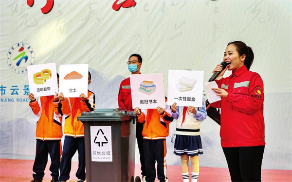 “小手拉大手”共同提倡垃圾分类。