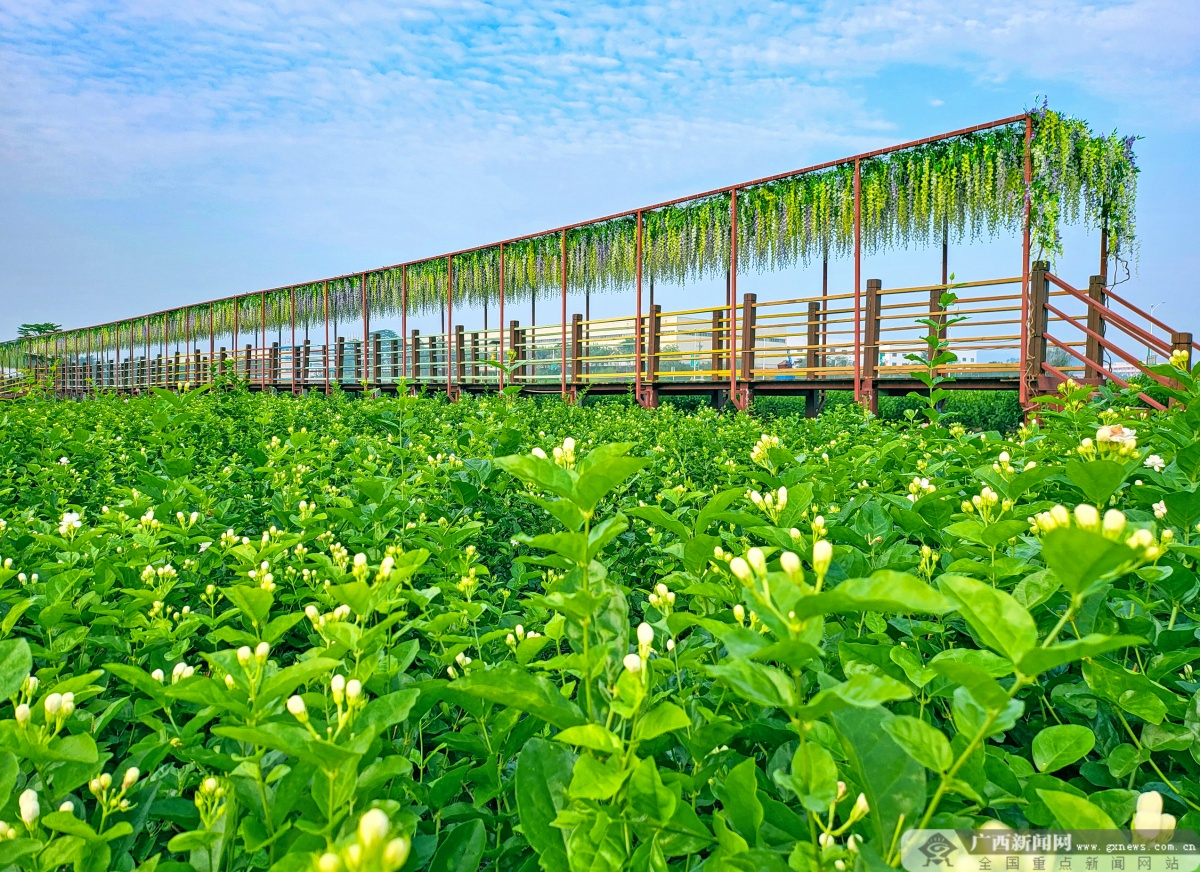 广西新闻网横州9月30日讯(通讯员 苏寒梅)九月的横州茉莉飘香,走进该市中华茉莉园,万亩茉莉花田一望无际,蔚为壮观。花田里,花农们正忙着采摘茉莉花,游客们纷至沓来,在花海里游玩拍照。 近年来,横州市立足资源禀赋,推动茉莉花由单一的花茶产业,向盆栽、康养等9个产业延伸,从一朵花到茉莉花全产业链,实现了立体综合性大开发,使得横州茉莉花“绽放”出绚丽的产业之花。