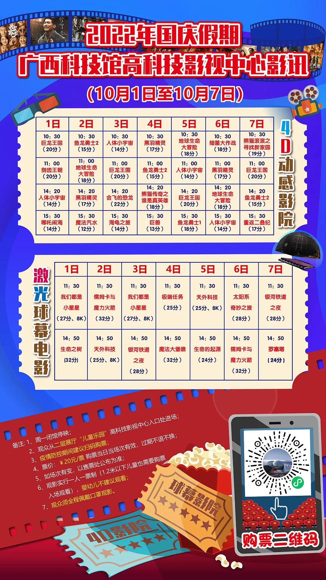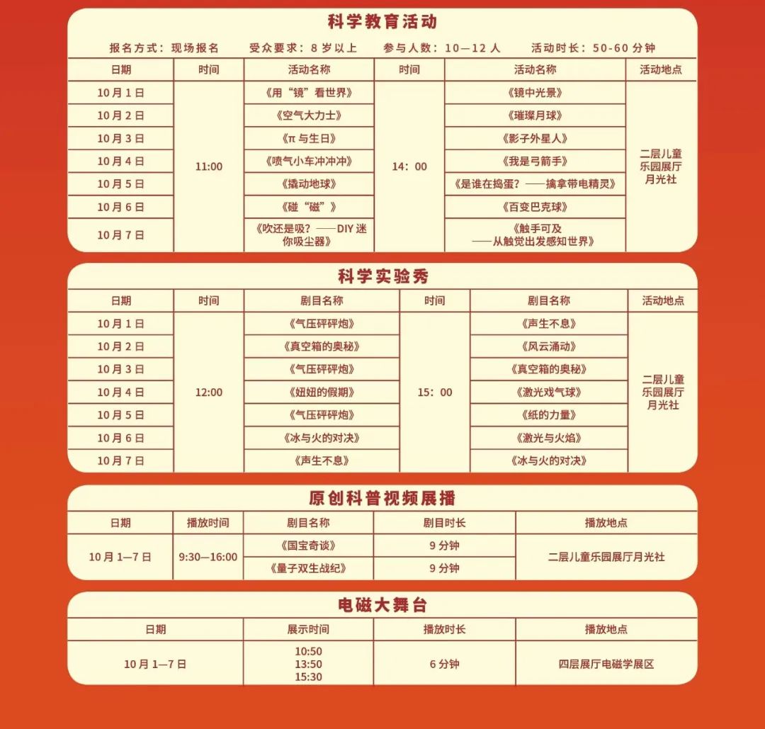 金秋十月,举国欢庆。 各位大朋友小朋友们,国庆黄金周近在眼前,你们准备好了吗?这个假期里,广西科技馆邀请大家畅享缤纷科普! 2022年国庆节期间开放温馨提示: 根据《国务院办公厅关于2022年部分节假日安排的通知》精神,结合我馆运营情况,现将放假期间开放时间安排如下: 10月1日至10月7日国庆节假期正常开馆; 10月8日至10月9日正常开馆; 10月10日(星期一)闭馆,对场馆内设施进行检修及消毒。 科学家精神主题科普活动