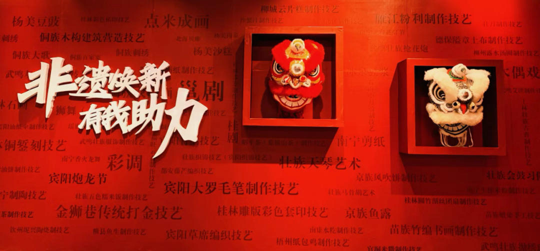 “爱上非遗”科普展以“非遗+科普”,展示了非遗技艺背后的科学魅力。我们设置了“非遗焕新 有我助力”打卡墙,并“请”来两尊醒狮“上墙”,邀您一起合影打卡,助力非遗传承! “青竹化丝手中造 剖为团扇编成画”的桂林圆竹剖丝团扇,“飞针引线 细刺巧绘 浓艳丛中堆锦绣”的壮族刺绣,“交刀游剪红吉纸 素手展绘壮乡情”的南宁剪纸,“髹漆揩磨终成器 熠熠华彩存千年”的桂林漆器……让我们一起领略非遗之美,探寻科学之魅!