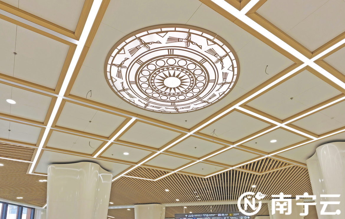 该项目采用地下建筑的形式来实现枢纽换乘功能,设计理念寓意“凤鸾叠舞、凤翎山水”。在项目室内空间,铜鼓纹饰点缀其中,山水线条元素则融入下沉广场的园林景观中,让人感受到浓郁的壮乡风情。