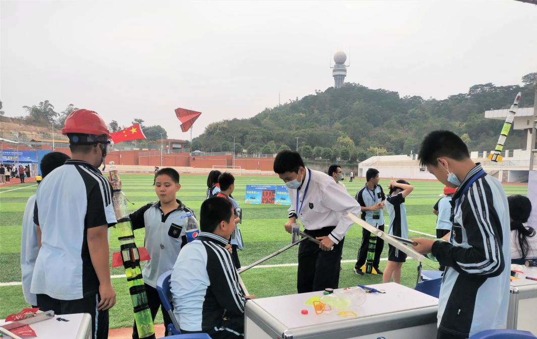 中国—东盟青少年科技运动会中国广西区赛场“气火箭”项目制作、调试现场。