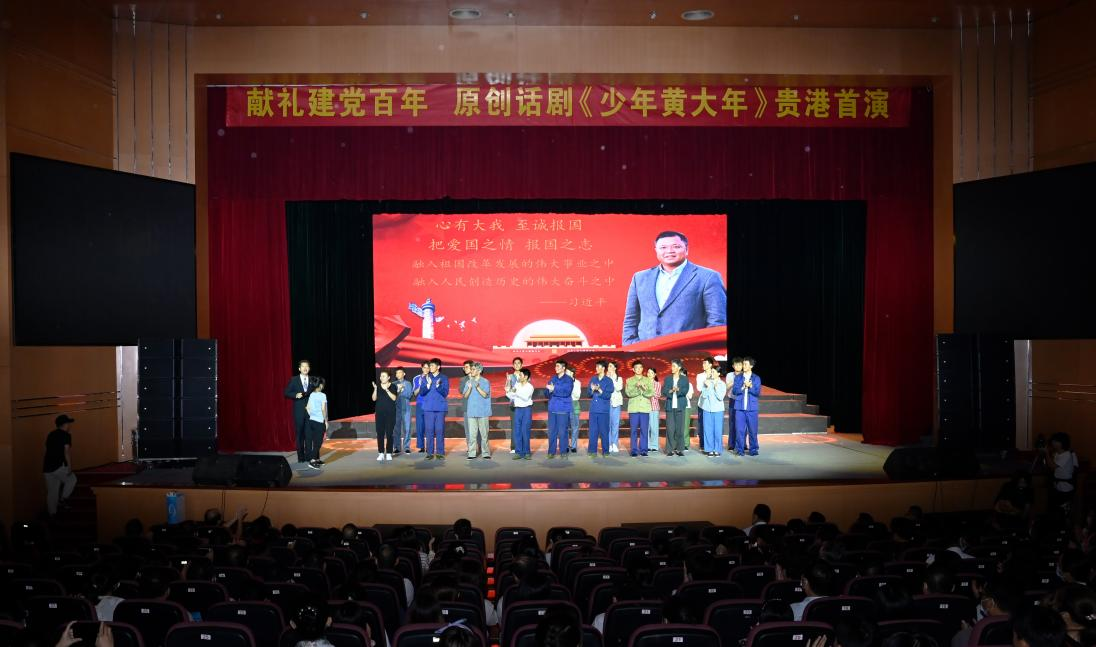 二、联合广西艺术学院影视与传媒学院,精心打造的原创话剧《少年黄大年》。该话剧于6月28日晚在贵港市会议中心隆重首演,还以线上直播的方式面向社会公众。出席首演活动的领导及社会各界群众1000多人,当晚同步在线观众上万人,点击量近11万人次。11月16日,《少年黄大年》在南宁市第二中学(凤岭校区)隆重上演。南宁市第二中学500多名师生现场观看演出,全区超600万人次中小学生通过“小博士报”微信公众号等观看线上直播,反响热烈。2022年该话剧计划在广西再演出5场。学校把话剧作为学校的非物质文化加以传承,每年都挑选高一新生排练此话剧。学生通过观看和排演话剧,感受黄大年的崇高精神,激发坚持不懈、勇于探索的科学精神,不断提高科学素质。