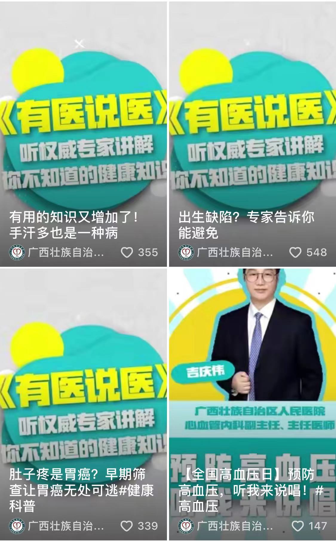 2021年6月,广西壮族自治区人民医院在微信公众号开设《科普时间》《医生说》栏目,同年9月在视频号、抖音号开设《有医说医》栏目。这两档栏目以拍摄该院健康科普专家库成员讲述健康科普知识为主,从源头上保障健康科普知识的专业性、权威性。栏目以通俗易懂的语言和群众喜闻乐见的形式,讲述疾病症状、发病机制、治疗方式、预防手段等,不定期结合疾病日、节气节点、重要特殊节日等,通过健康科普文章、科普长图、漫画、视频等形式向公众推送健康科普知识。