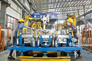 3月13日,柳州河西高新技术产业开发区一汽车零部件公司车间,工人在给机器人下料。该公司自动化率达95%以上,车间里的120多台机器人整天都在忙碌着,工人只需做上料下料辅助工作。公司高峰期月产值4500万元,即使平峰期也达3000万元。记者 覃伟立 摄(广西新闻网-广西日报)