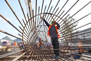 4月6日,在从江—融安—荔浦高速公路融安段融江特大桥施工现场,工人们正加紧施工。该公路总投资216.1亿元,主线全长约111公里,建设工期4年。项目建成后,将成为贵州经广西至广东最便捷的省际通道。韦荣军 卫纲 摄(广西新闻网-广西日报)