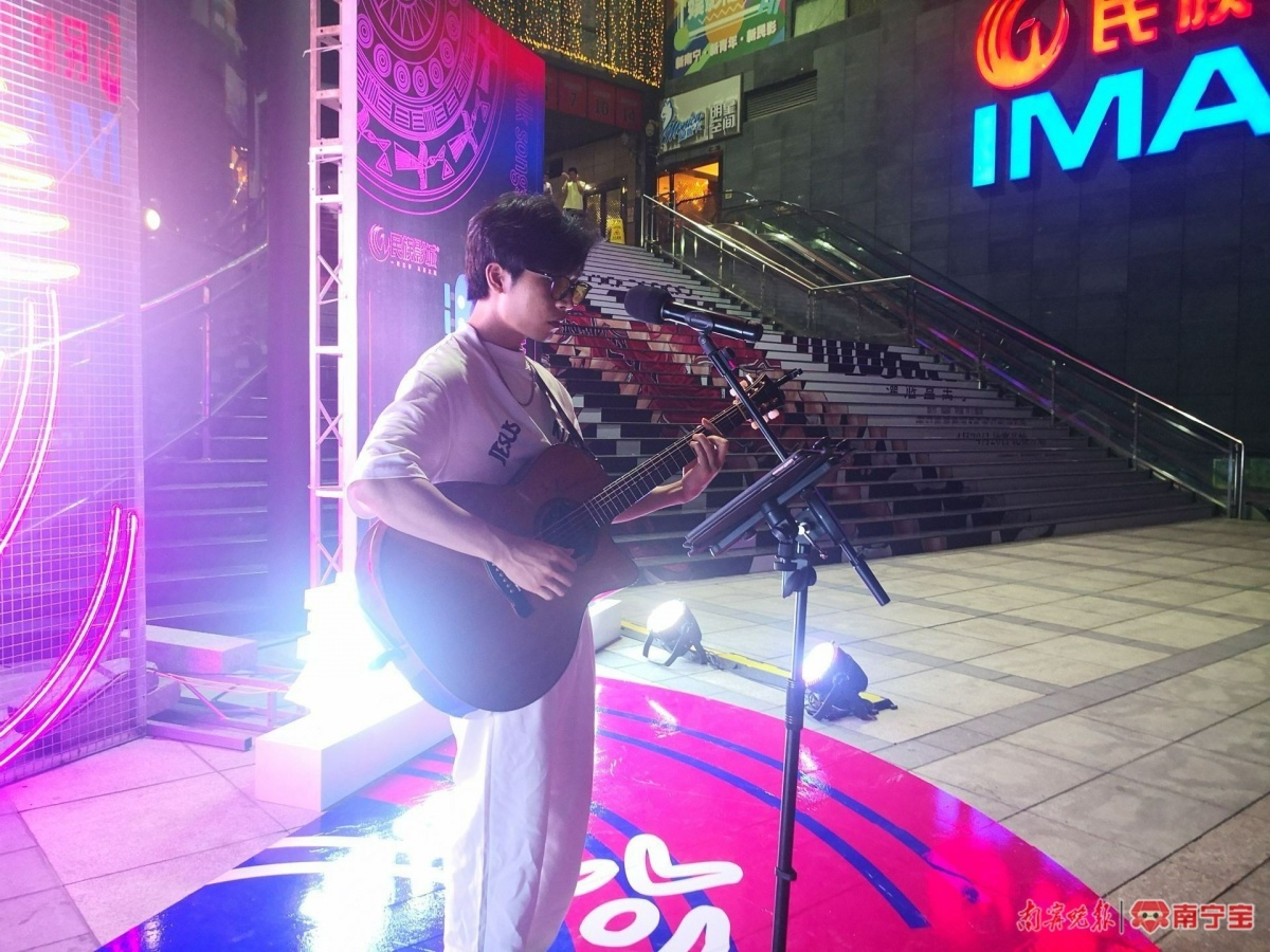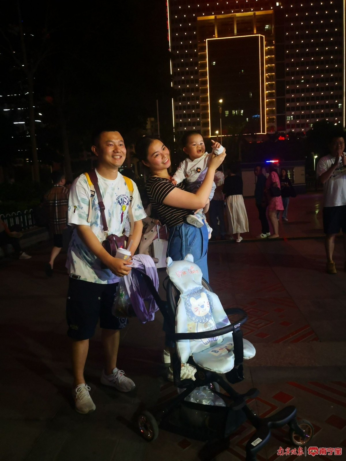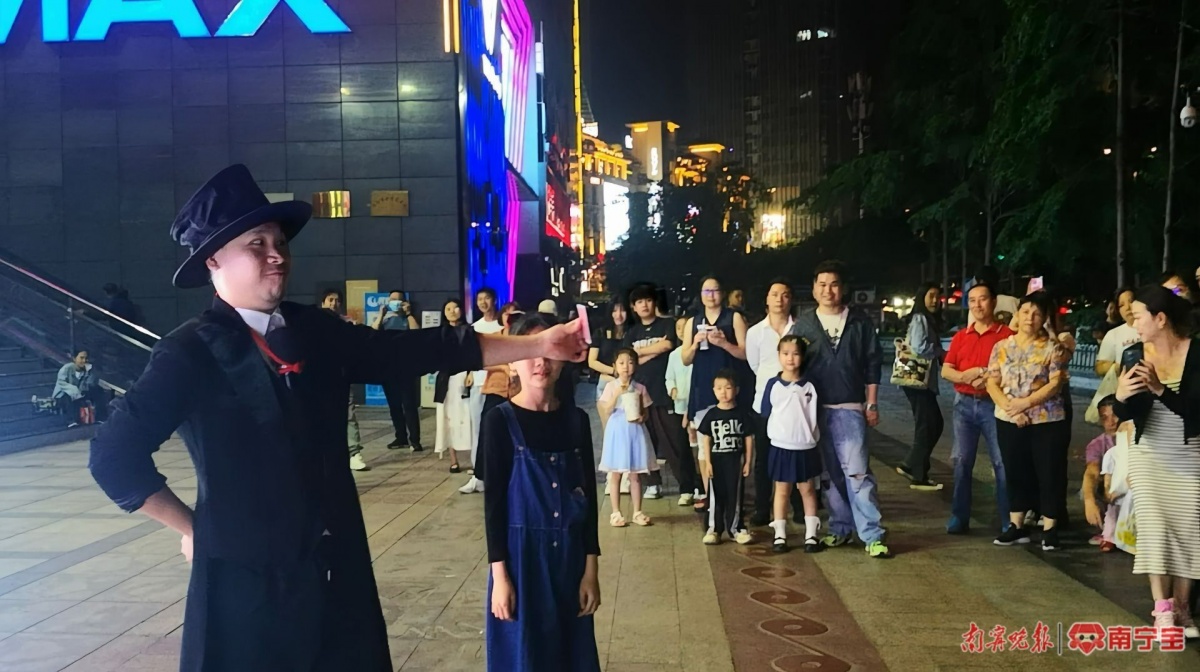 魔术师邀请现场小朋友体验魔术表演 在热烈的氛围带动下,一名自称从广东来的男孩展现了他多才多艺的一面。他从小学五年级就开始玩音乐,如今还有自己的乐队。从广州来南宁旅游的开朗女孩邱小姐上场献歌试了一回嗓子后,在接受采访时说:“确实互动更嗨!同时,我觉得南宁特别干净和漂亮,这里的人们也非常热情。这让我很欣喜。” 年轻妈妈李君婧与爱人带着孩子回母校所在地南宁旅游,当晚正巧路过民族影城表演现场,于是主动登台献艺。她说:“我曾在广西艺术学院舞蹈专业学习,平时也很爱唱歌。这次专门从重庆回来,再次感受到了南宁这座城市的包容。”