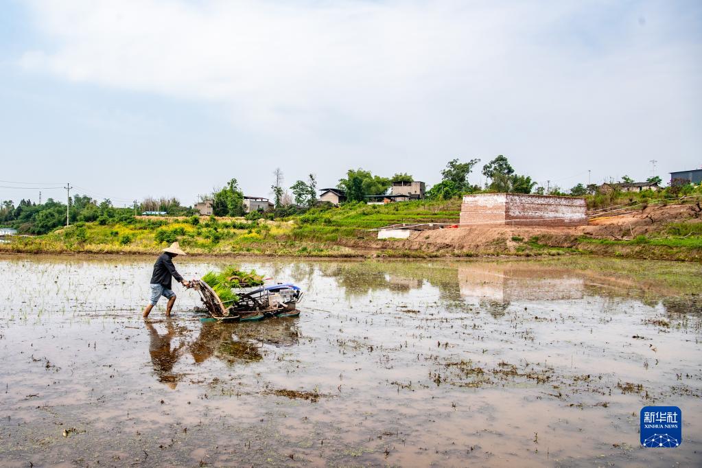 5月4日,在重庆市合川区大石街道龙骨村,农民操作农机插秧。 目前,地处重庆西北部、被誉为“巴渝粮仓”的重庆市合川区粮食耕种进入冲刺阶段。稻农们忙碌在田间,通过直播、机插秧、人工移栽等方式,抢抓农时,播种插秧。 “巴渝粮仓”合川区,粮食总产量连续多年位居重庆市首位。 新华社记者 唐奕 摄