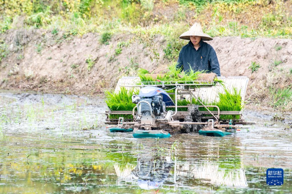 5月4日,在重庆市合川区大石街道龙骨村,农民操作农机插秧。 目前,地处重庆西北部、被誉为“巴渝粮仓”的重庆市合川区粮食耕种进入冲刺阶段。稻农们忙碌在田间,通过直播、机插秧、人工移栽等方式,抢抓农时,播种插秧。 “巴渝粮仓”合川区,粮食总产量连续多年位居重庆市首位。 新华社记者 唐奕 摄