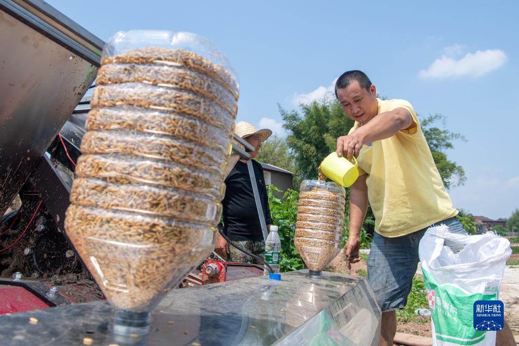 5月4日,在重庆市合川区涞滩镇碾盘村,农民在为直播机添加种子。 目前,地处重庆西北部、被誉为“巴渝粮仓”的重庆市合川区粮食耕种进入冲刺阶段。稻农们忙碌在田间,通过直播、机插秧、人工移栽等方式,抢抓农时,播种插秧。 “巴渝粮仓”合川区,粮食总产量连续多年位居重庆市首位。 新华社记者 唐奕 摄